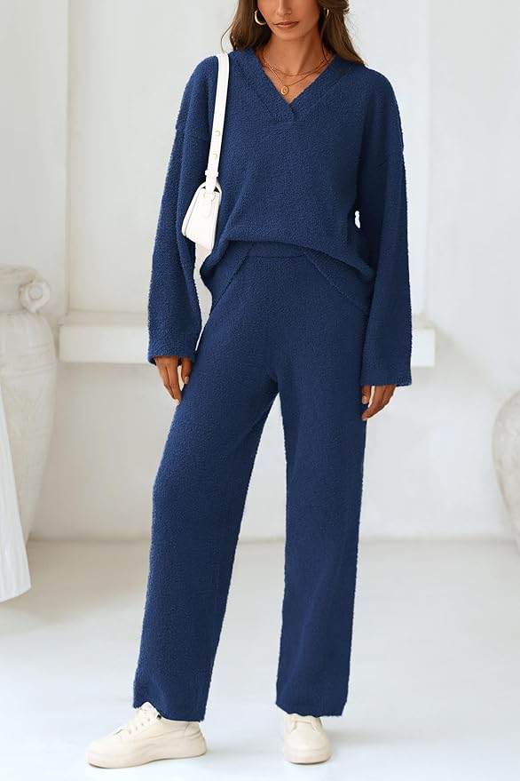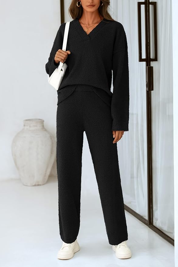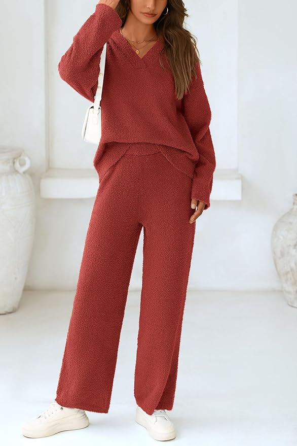 Crafted from a premium fuzzy-touch fabric, this set feels like wrapping yourself in a warm cloud. The oversized V-neck top drapes effortlessly for that relaxed, off-duty look, while the matching high-waist wide-leg pants create a flattering silhouette that moves with your body. It’s the perfect balance of snug and breathable — warm enough for cool days, light enough for all-day wear.